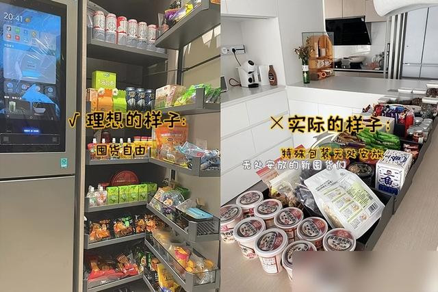 结果柜子空荡荡,角落堆满零食杂物,玻璃门反光还显乱。