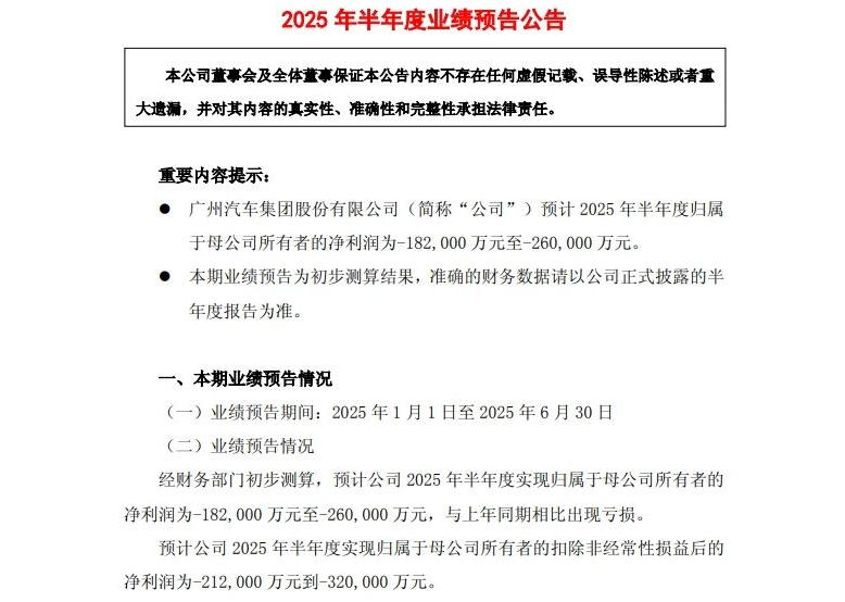 7月11日,广汽集团发布的业绩预告显示,2025年上半年归属于母公司所有者的净利润为-18.2亿元至-26亿元,而去年同期盈利15.16亿元。近十年来首次出现半年度亏损,落差超过33亿元。